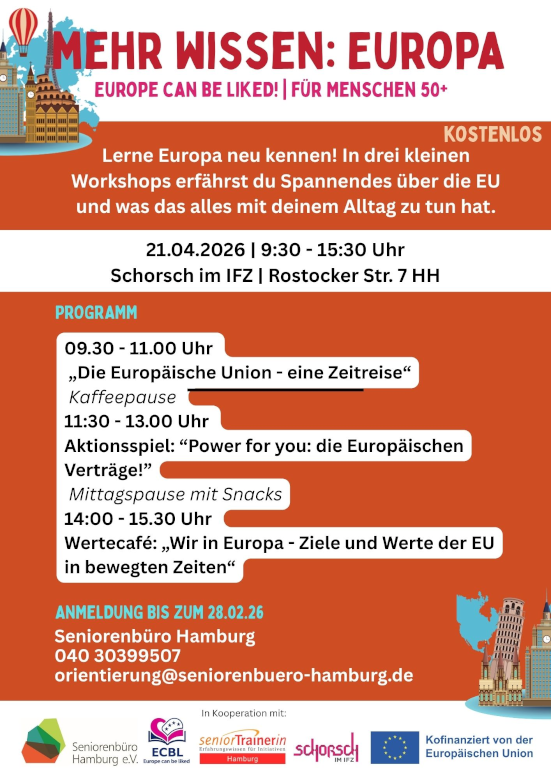 In einem Workshop am 21. April 2026 von 9:30 bis 15:30 Uhr erfahrt ihr Spannendes über die EU. Die Veranstaltung findet statt im Schorsch im IFZ in Hamburg, St. Georg.